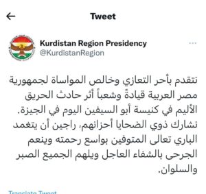 وتقدمت رئاسة إقليم كوردستان العراق عبر صفحته الرسمية اليوم ببرقية عزاء كتب فيها: ” نتقدم بأحر التعازى وخالص المواساة لجمهورية مصر العربية قيادة وشعبا أثر حادث الحريق الأليم فى كنيسة ابو السيفين اليوم، ونشارك ذوى الضحايا أحزانهم، راجين أن يتغمد البارى تعالى المتوفين بواسع رحمته وينعم الجرحى بالشفاء العاجل ويلهم الجميع الصبر والسلوان.