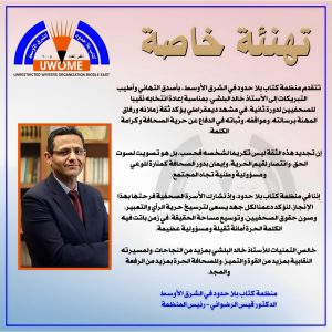 بكل فخر واعتزاز، يتقدّم الدكتور قيس الرضواني، رئيس منظمة كتاب بلا حدود – الشرق الأوسط، بأسمى آيات التهاني وأصدق عبارات المباركة للكاتب الصحفي القدير خالد البلشي، بمناسبة تجديد الثقة فيه نقيبًا للصحفيين لدورة ثانية، في الانتخابات التي جرت اليوم الجمعة.